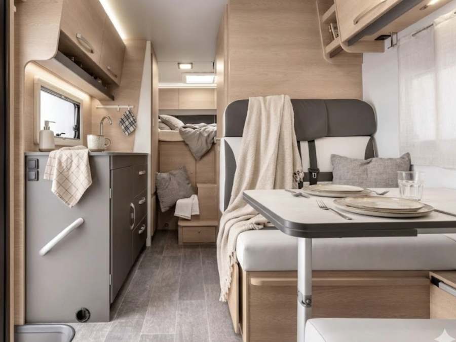 Con capacidad para 5 personas en ruta y varias plazas para dormir, ofrece una distribución espaciosa, cocina completa, baño con ducha independiente y gran capacidad de almacenamiento.